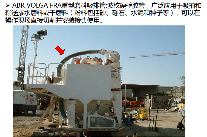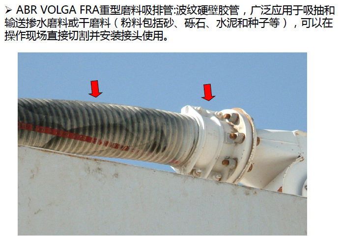應用范圍: 波紋硬壁膠管,廣泛用于吸抽和輸送摻水磨料或者只是粉 塵(砂,礫石,水泥,種子等), 可以在操作現場直接切割并安裝 接頭使用
